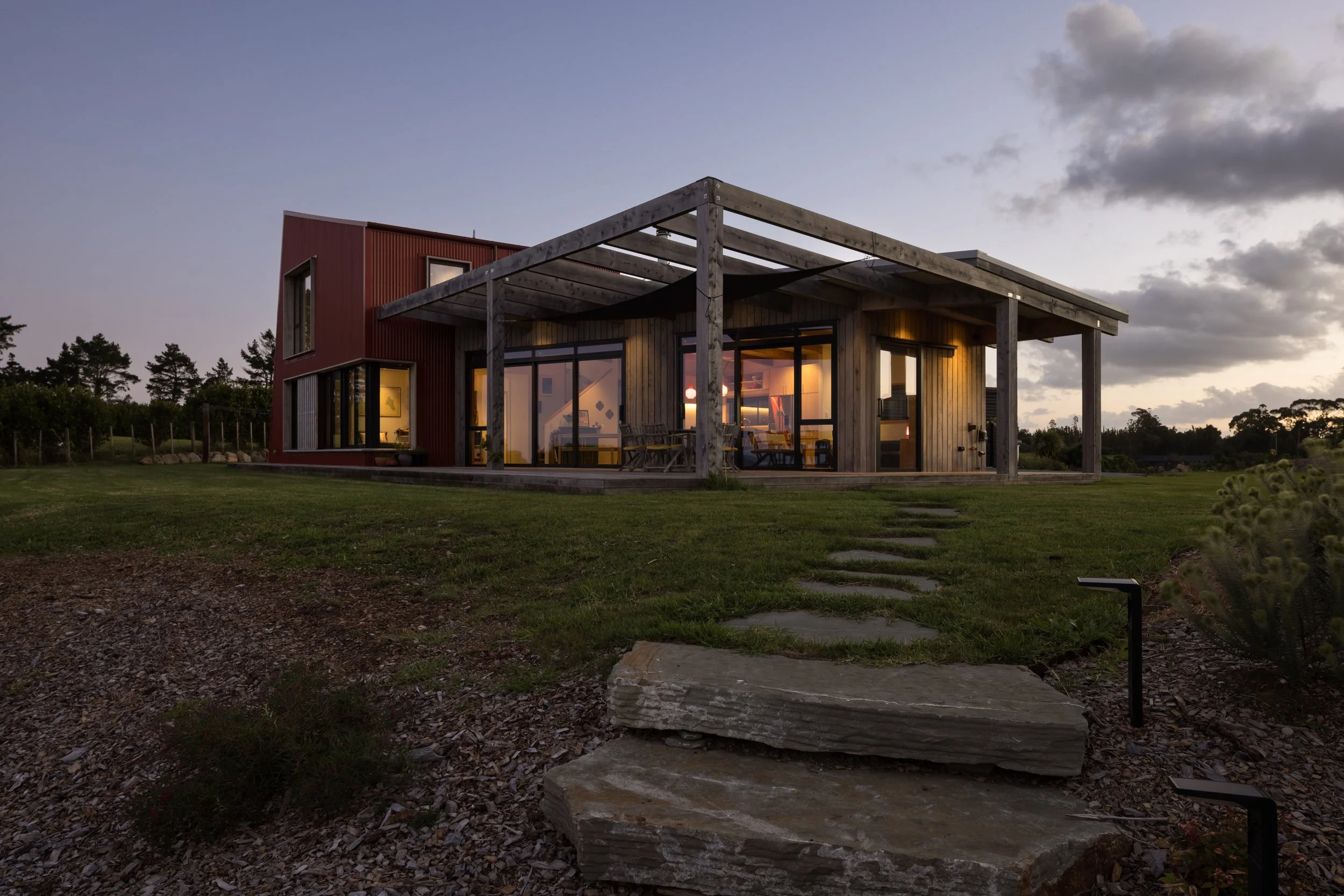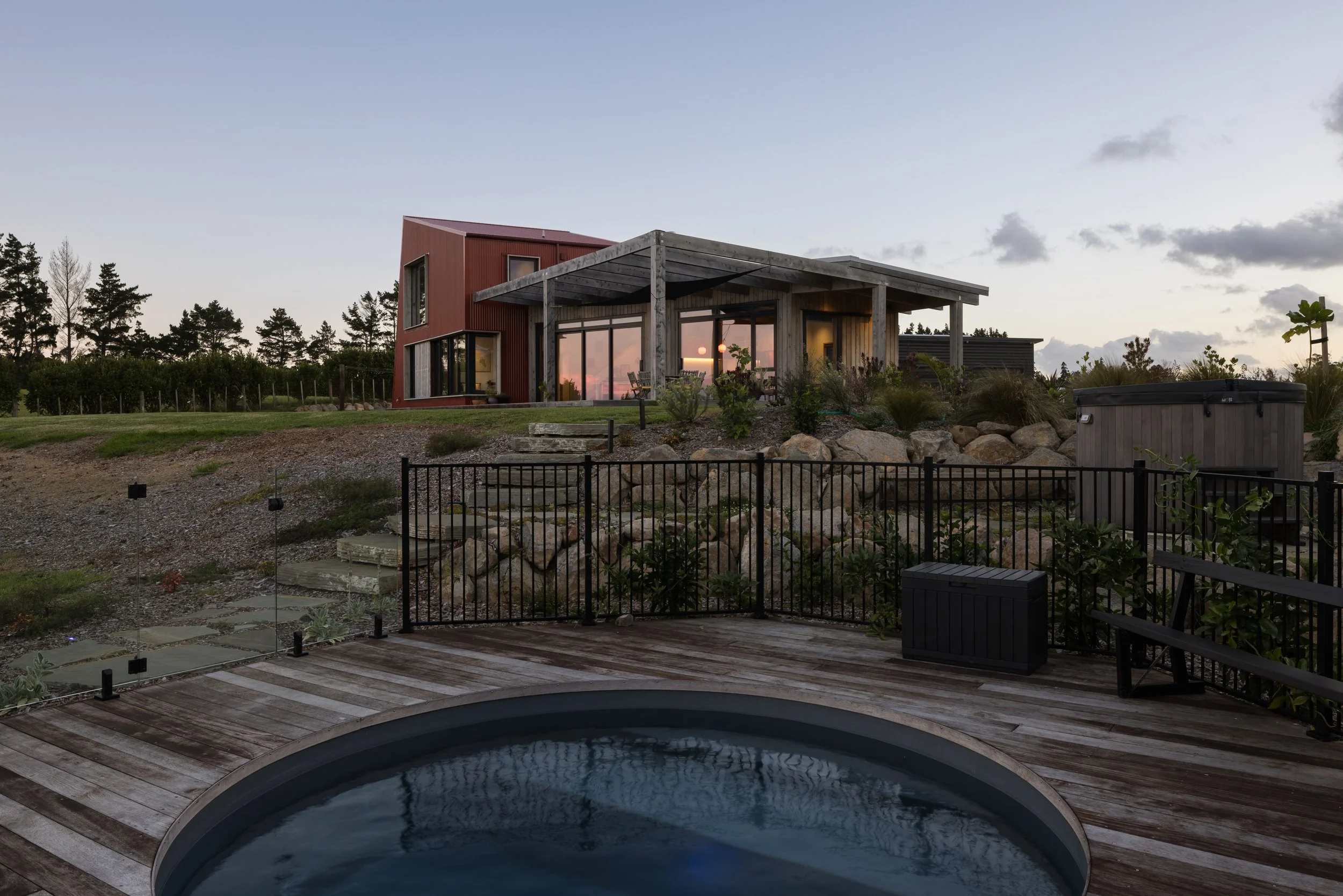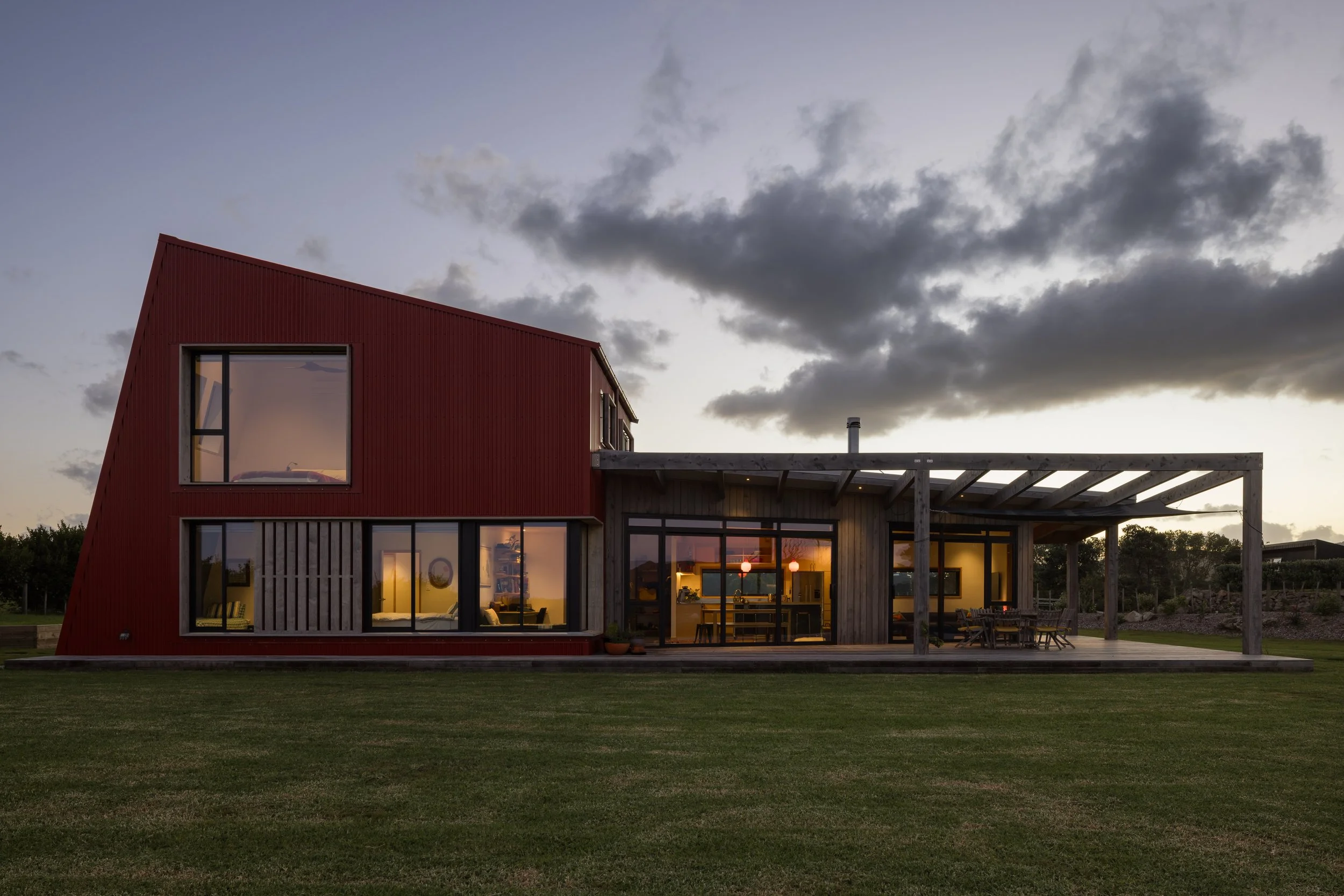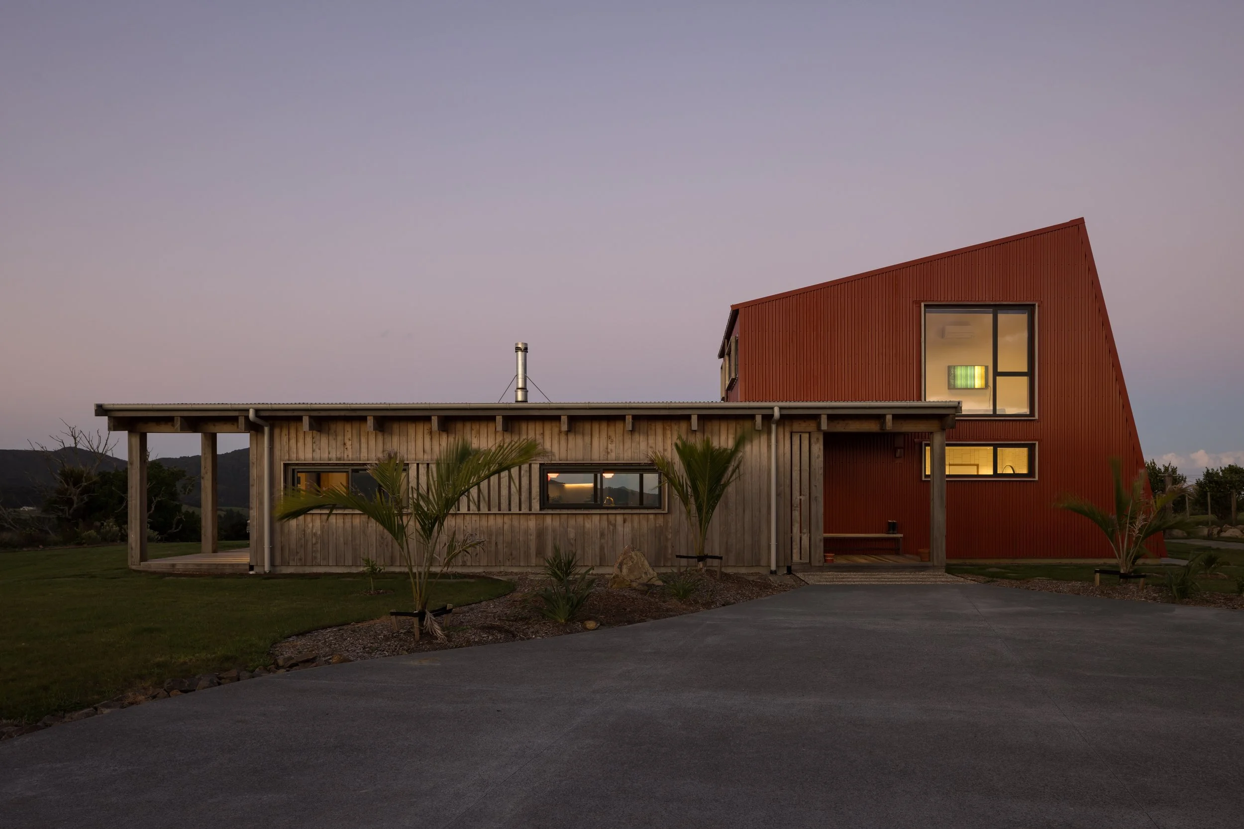 Positioned on an elevated and well-oriented site in Mangawhai, this architecturally detailed residence utilises a refined palette of Pioneer Red corrugated steel and vertical Macrocarpa cladding to establish a robust yet warm material expression suited to the coastal environment. Designed by David Maurice of LTD Architectural Design Services, the home is organised around a carefully considered floor plan comprising three bedrooms, a dedicated study, and three bathrooms.